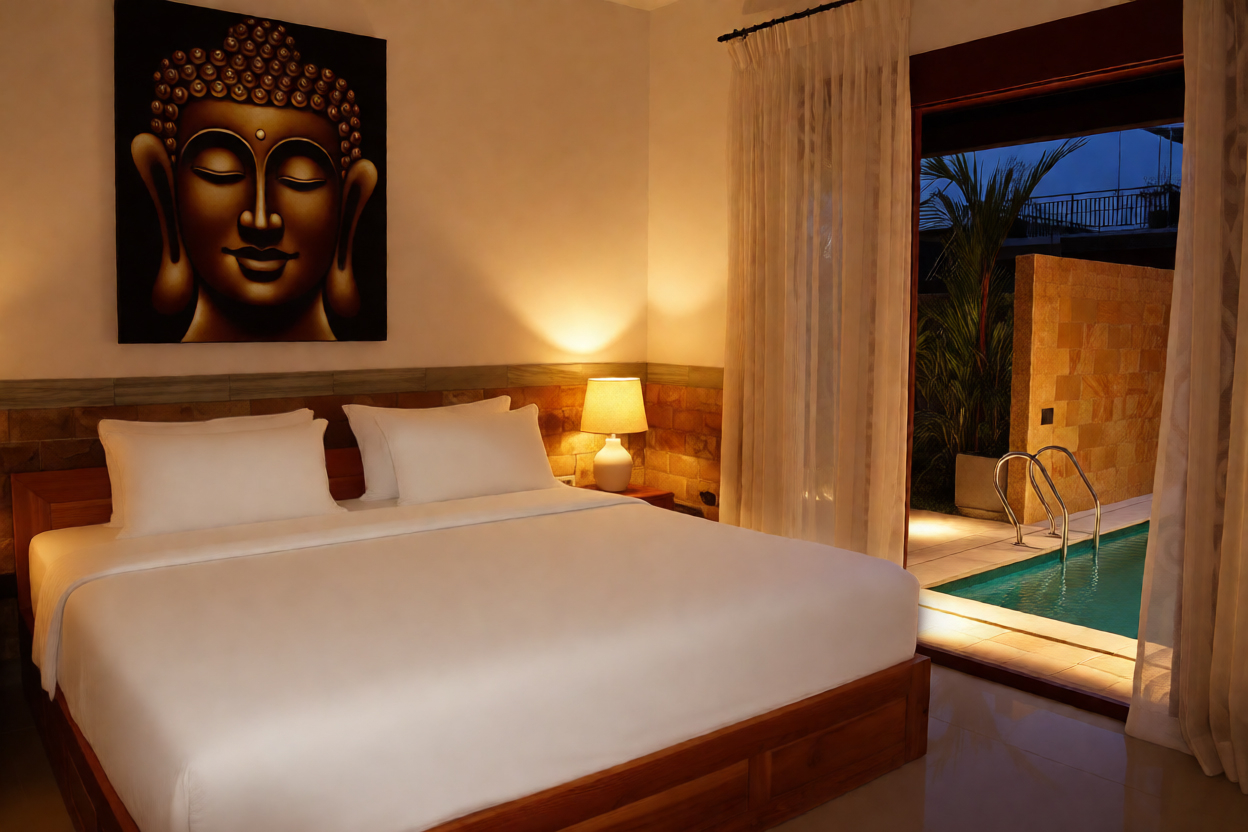 The VILLA PAPA PUTU is a private villa retreat blending Balinese charm with European comfort. Designed for romance and intimacy, the villa features two beautifully appointed bedrooms and a private swimming pool, set within a serene and stylish space. Perfect for couples or quiet getaways, every detail has been thoughtfully crafted to create a truly special escape.